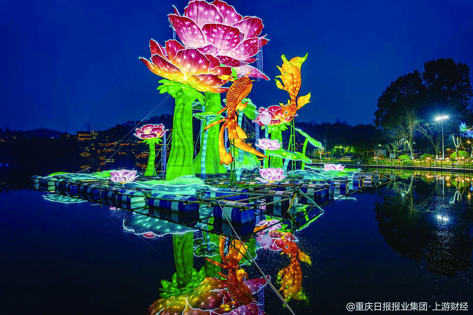 重庆园博园“山、水、桥、亭”交融的地貌让灯会跳出传统平地布灯模式,形成“灯在水中漂,人在画中游”的独特观赏体验。白天,游客可沿2.8公里的小径欣赏红梅、早樱与郁金香;夜晚,同一路径则变身为光影长廊,游客可以体验昼夜不同魅力。